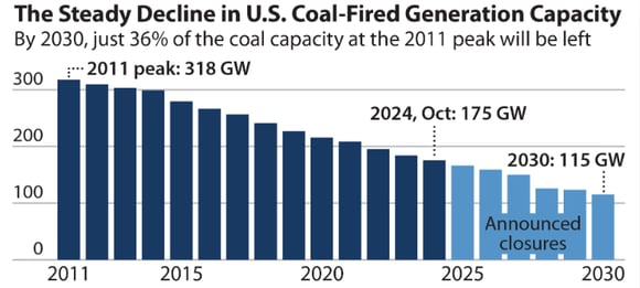 Source: IEEFA; "Nowhere to go but down for U.S. coal capacity, generation" (Oct 2024).