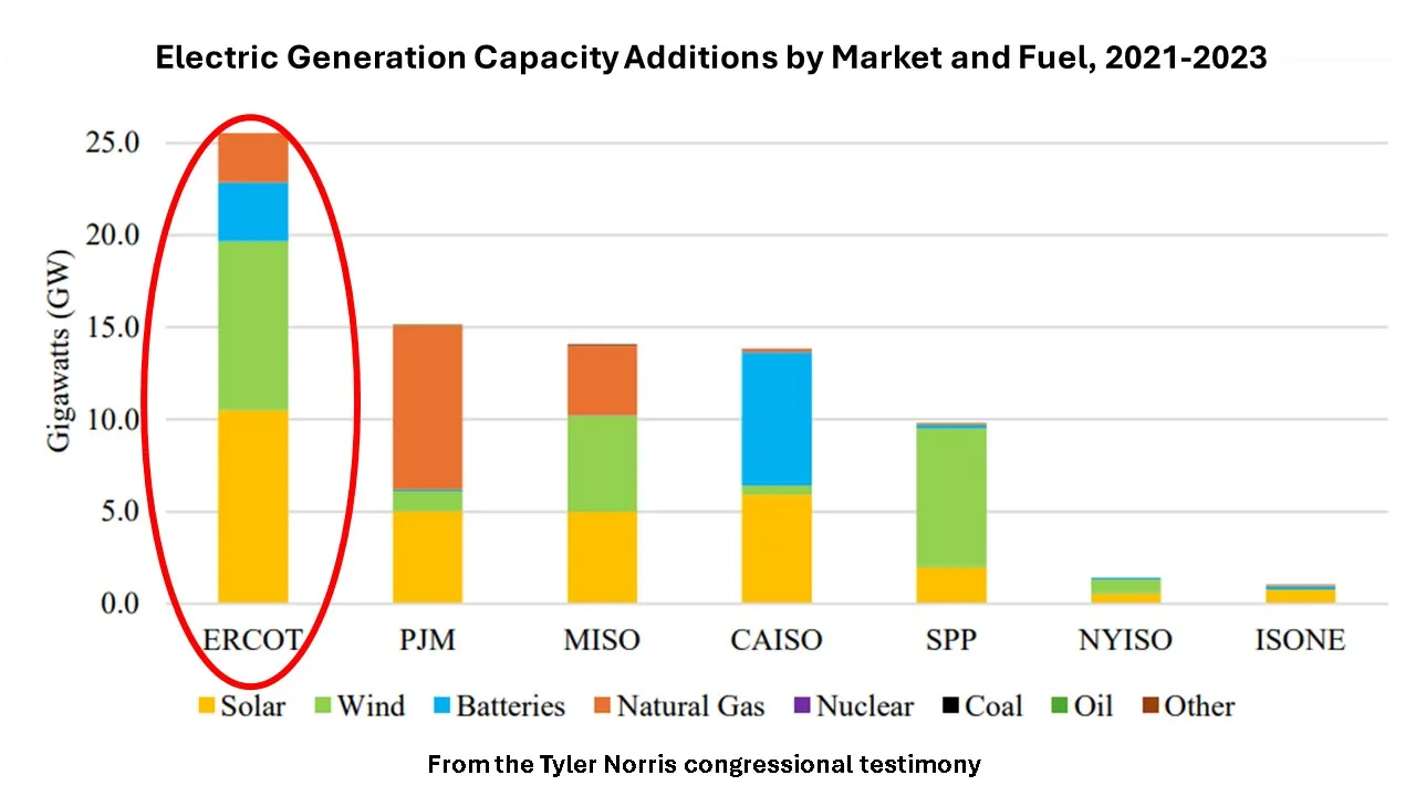 - ERCOT’s renewable infrastructure was developed in part due to a 2005 Texas legislature which implemented a 18,500 MW Competitive Renewable Energy Zone (CREZ) transmission complex. The legislation was grounded in the economic opportunity to bring cheap and abundant wind energy in West Texas to the major load centers in the East. This forward thinking and opportunistic development model led to immediate low cost wind generation and eventually solar interconnections to the CREZ lines at a pace that far exceeded even the most rosy expectations. Battery storage is next in line to benefit from this legislature as it’s needed to stabilize renewable output and improve loading of the transmission lines.