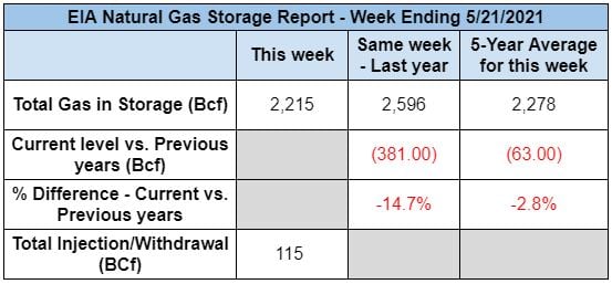 The U.S. Energy Information Administration reported last week that natural gas in storage increased by 115 Bcf. There was an injection for the same week last year of 105 Bcf while the five-year average injection is 91 Bcf. Total U.S. natural gas in storage stood at 2,215 Bcf last week, 14.7% less than last year and 2.8% lower than the five-year average for this time of year.